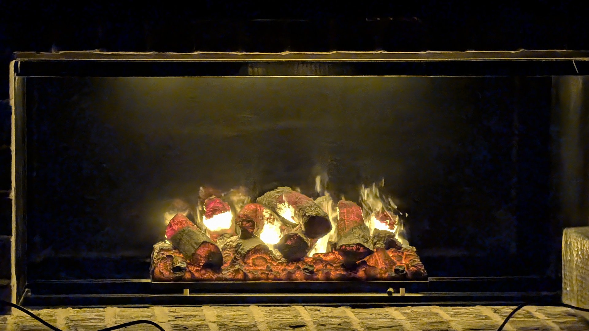 The fire floats against a wall of dimensional panels, casting shadows. No chimney. No flue. No masonry. It’s just the comfort of flickering light.